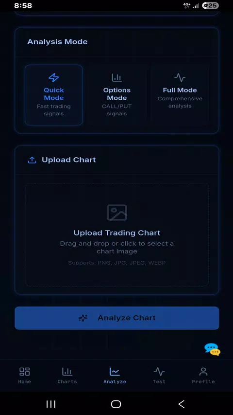 Three modes available: Quick Mode for fast chart signals, Options Mode for options trading focus, and Full Analysis Mode for comprehensive chart breakdown